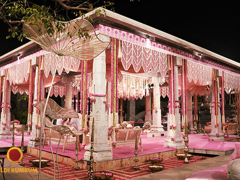 A grand South Indian Muhurtam unfolded in a regal stone mandap, wrapped in shades of pink — satin, brocade, and traditional florals. Intricately woven jasmine bud jalis, pearl-studded hangings, and embroidered accents added richness to the early morning setting. With delicate lotus motifs and fine garlands from Coimbatore, the atmosphere felt soft, sacred, and luminous.